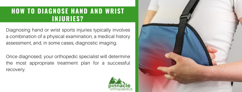 Diagnosing hand or wrist sports injuries typically involves a combination of a physical examination, a medical history assessment, and, in some cases, diagnostic imaging.