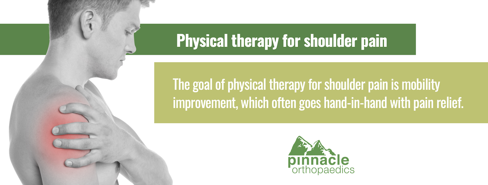 The goal of physical therapy for shoulder pain is mobility improvement, which often goes hand-in-hand with pain relief. The therapist will start with an assessment to measure strength, functional mobility, and your current range of motion.